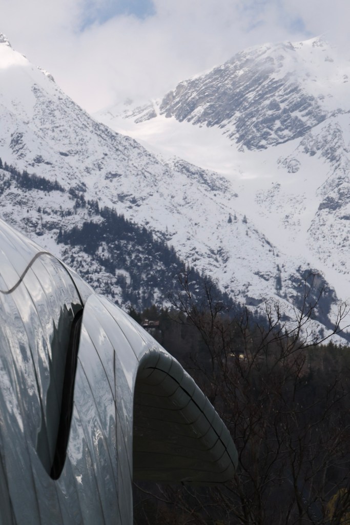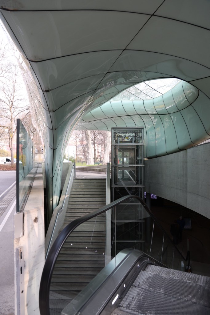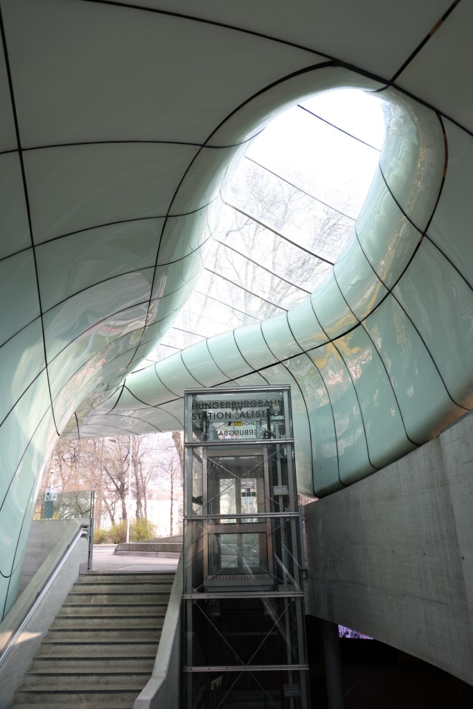 Die liegt aussen in den Schwüngen, die die Fasssade macht