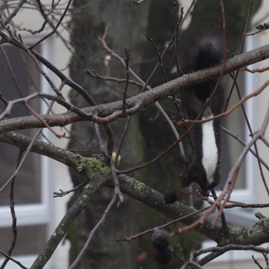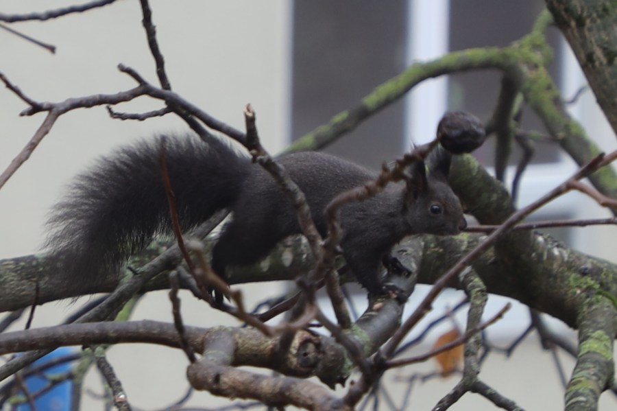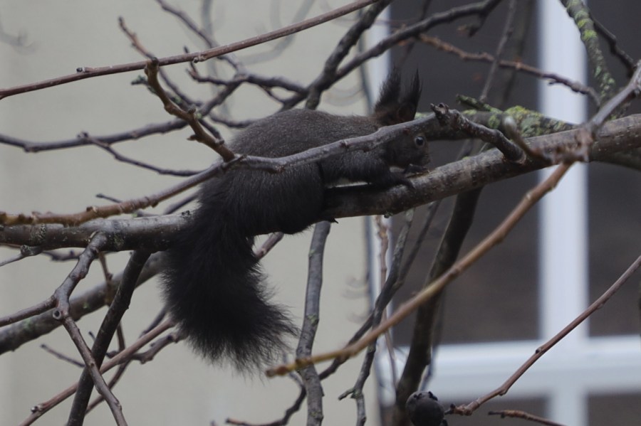 Das kleine schwarze Eichhrönchen überlegt des Morgens