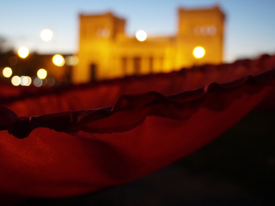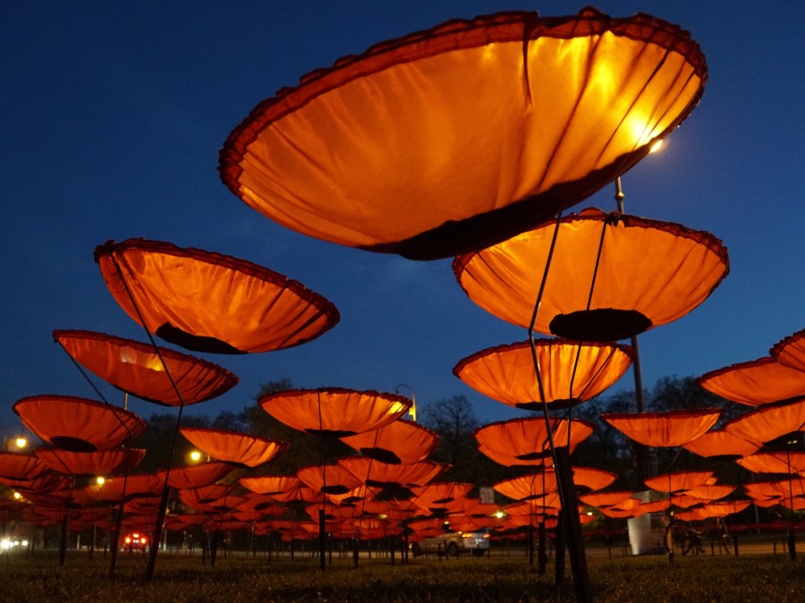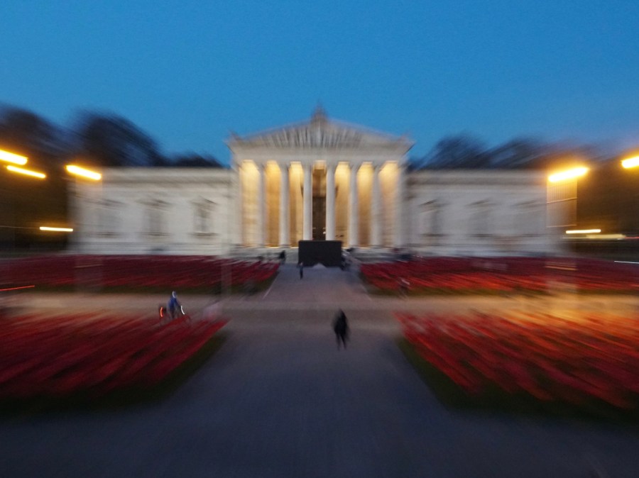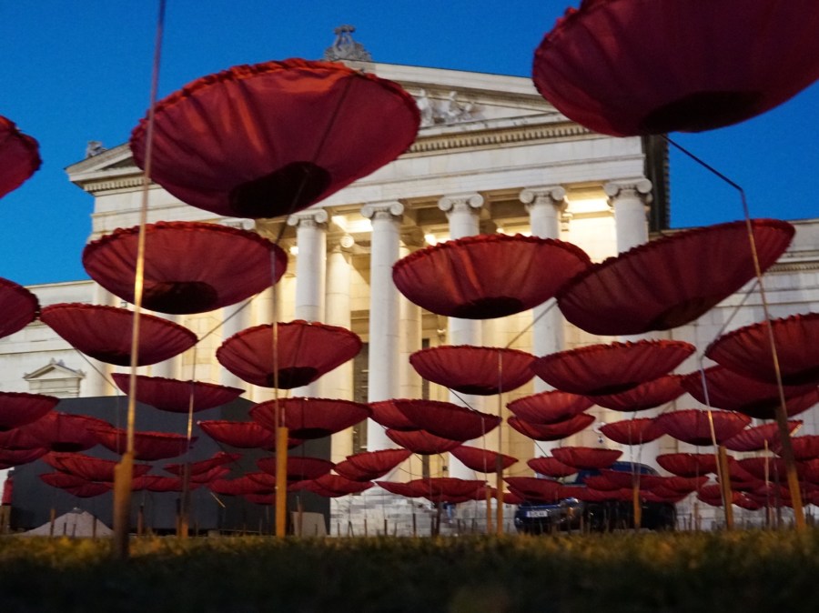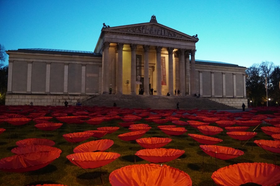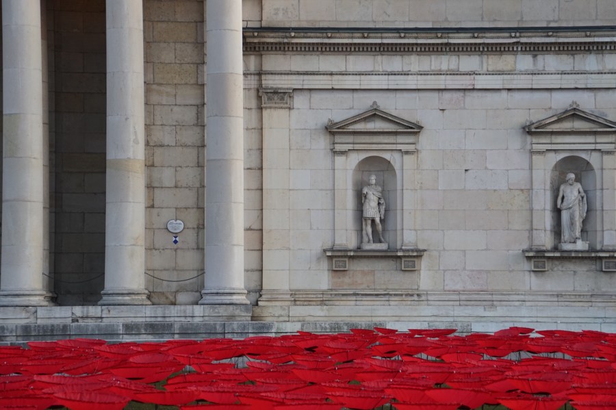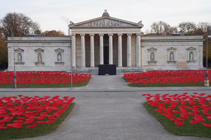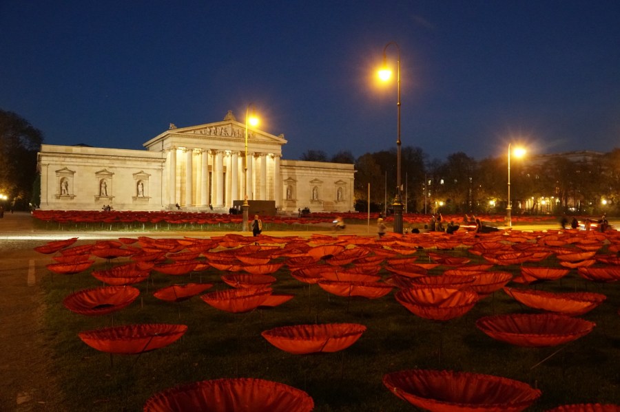 Dazu hat ein Künstler 3.200 Seiden-Mohnblumen auf dem Königsplatz aufgestellt.