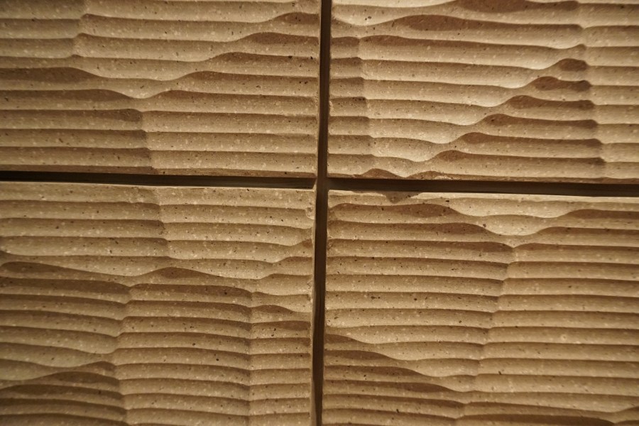 Die Akustikplatten an Wand und Decke mit Riffelung und Vertiefung je nach akustischer Notwendigkeit.