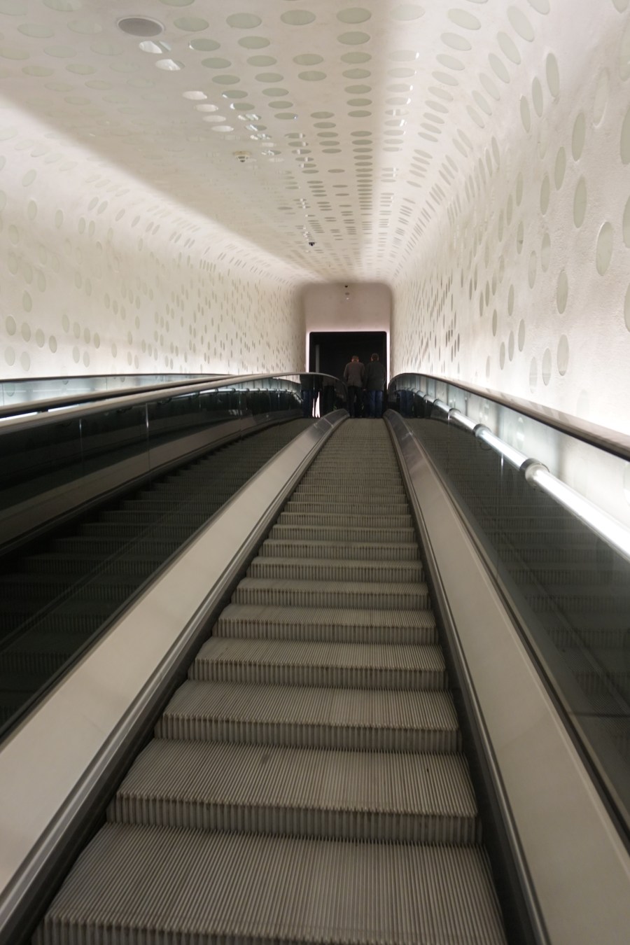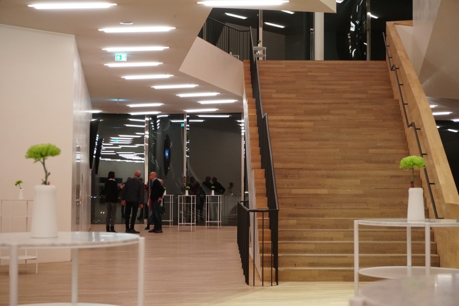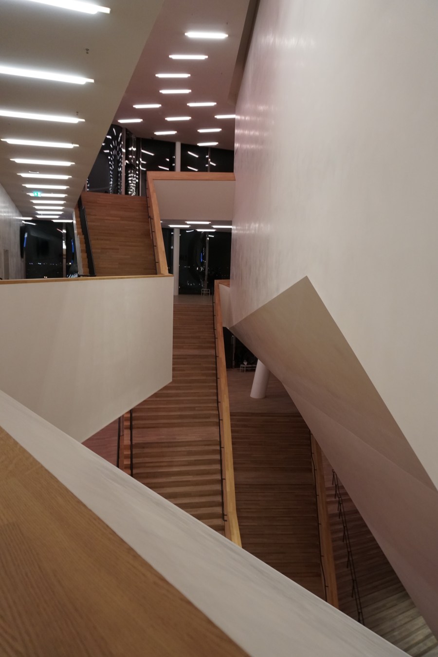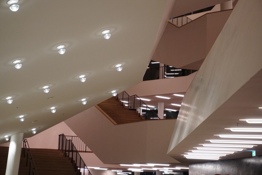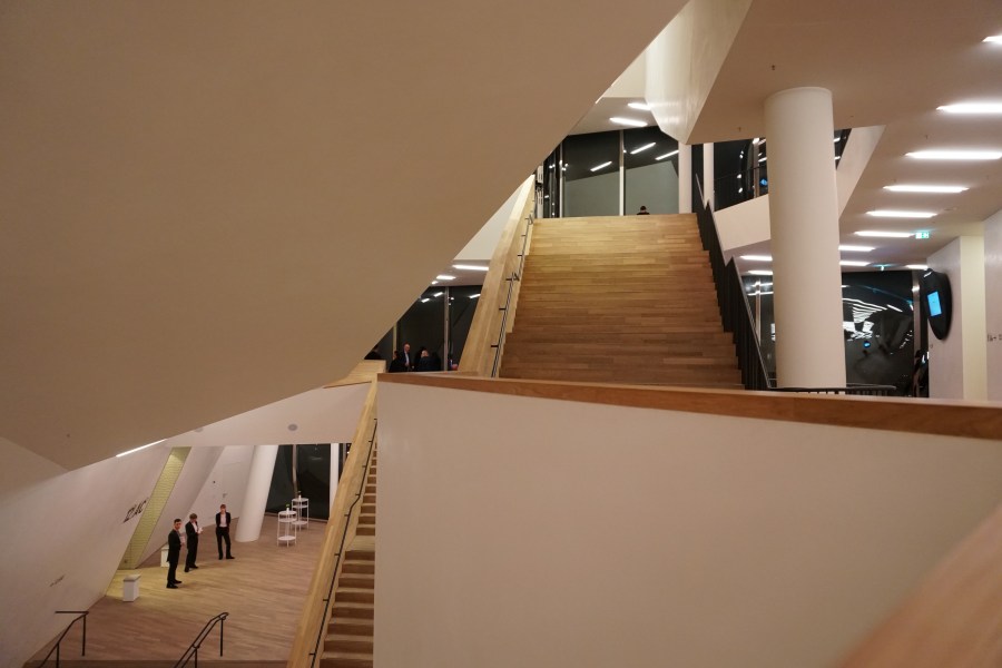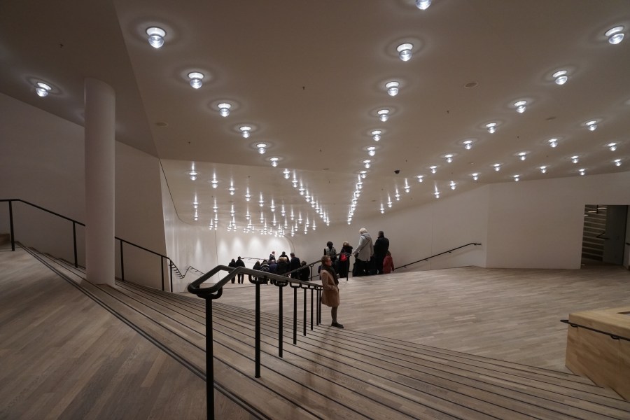 Man kann überall rauf und runter und ganz um den Saal rumlaufen. Von Hafenfensterseite zu Stadtfensterseite.