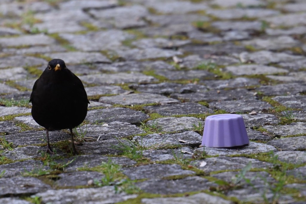 Die sandförmchenspielende Amsel war noch zuhause, aber ist es wirklich ein Sandspielzeug oder ein Funkgerät?