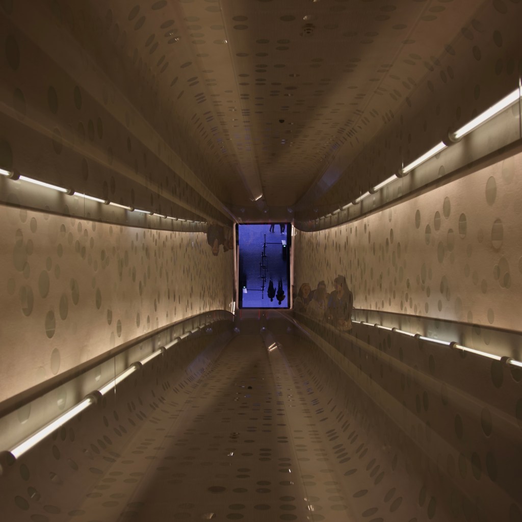 Es geht mit einem kleinen normalen Aufzug auf die oberste Ebene des Gebäudes. Und da sieht man wo es als nächstes hingeht