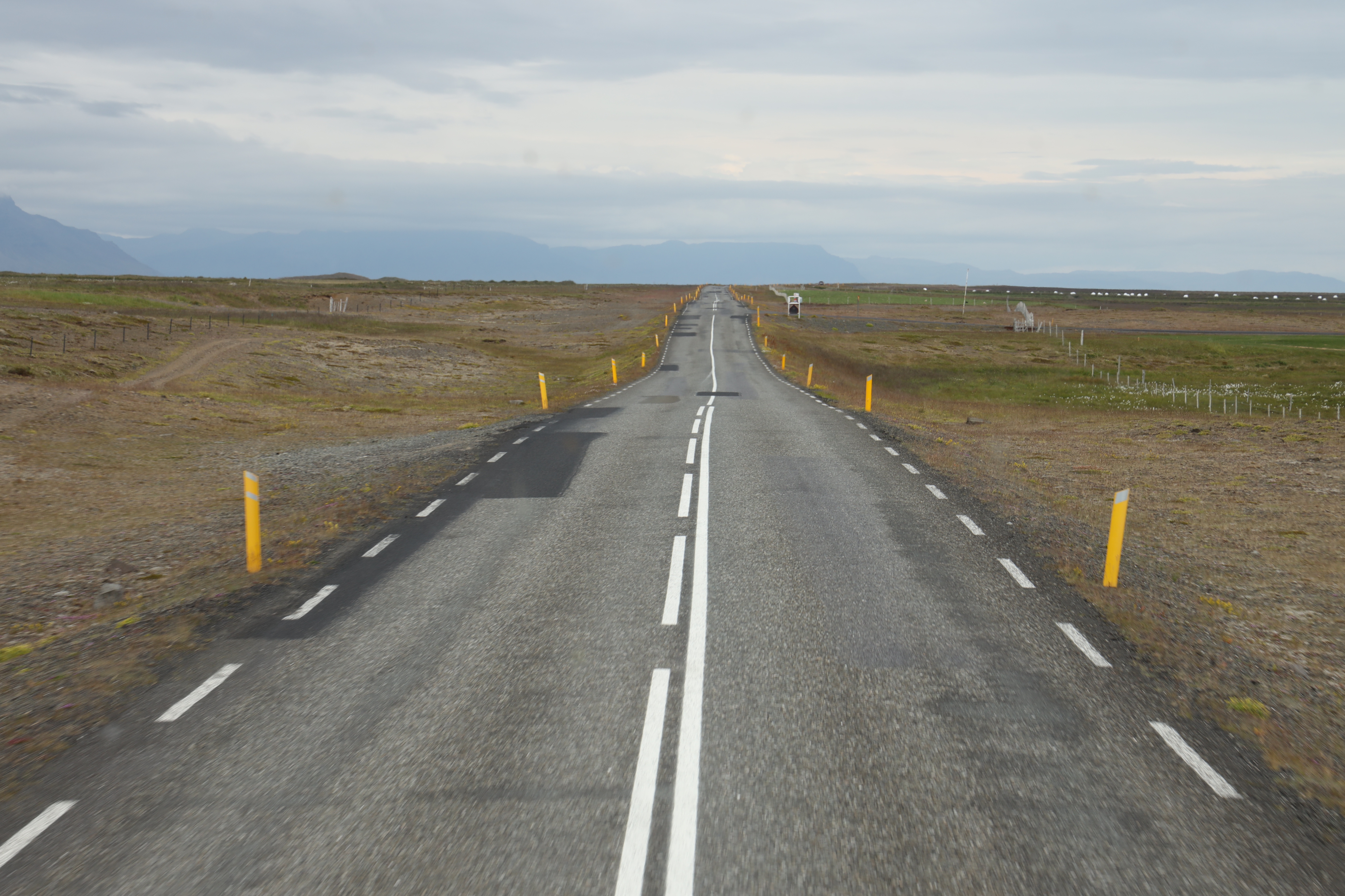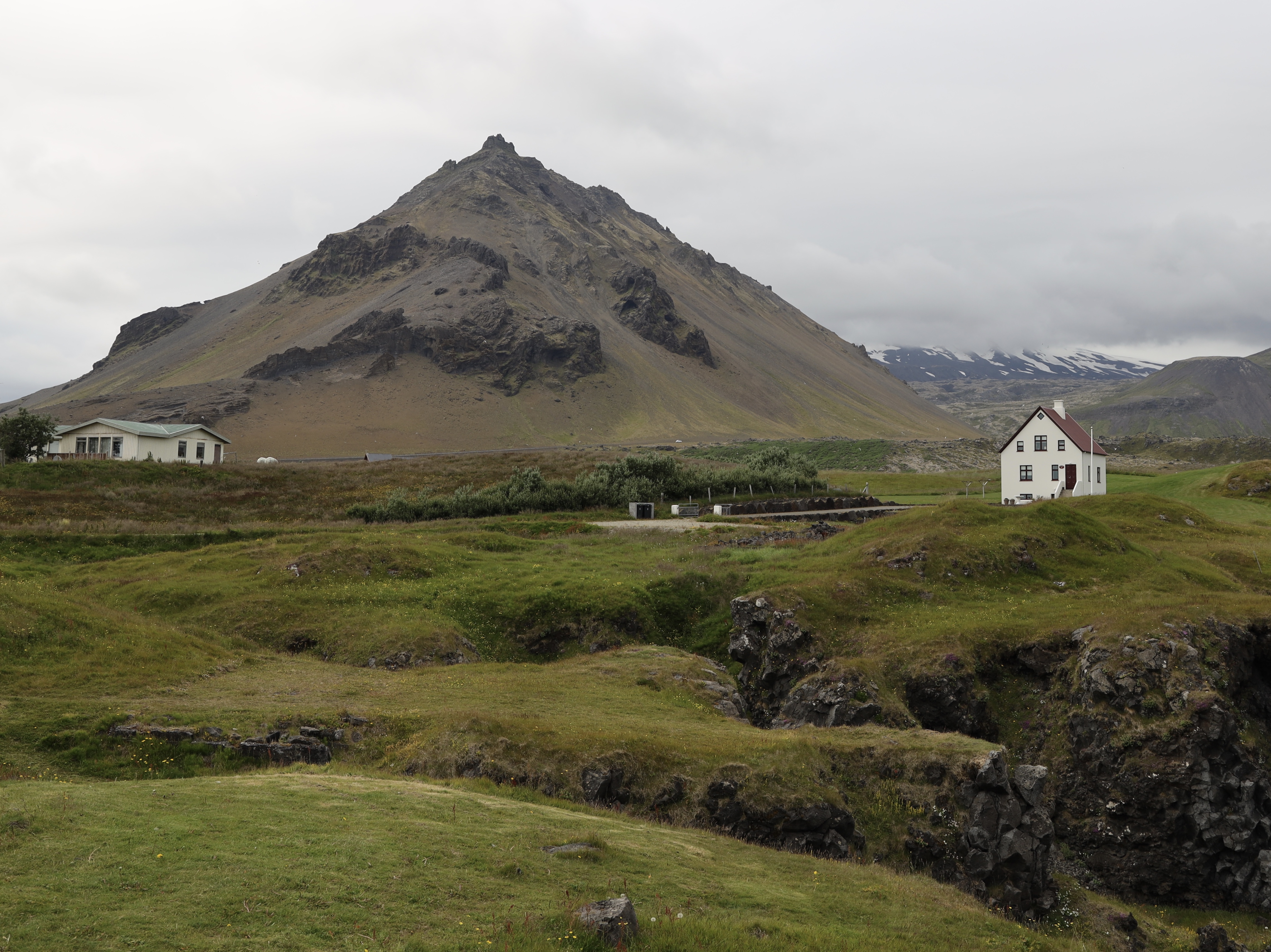 der Namensgeber Snaefellsnesjökull hat sich leider den ganzen Tag in eine Wolkendecke gehüllt. Oberhalb vom kleinen Haus rechts kann man ihn erahnen