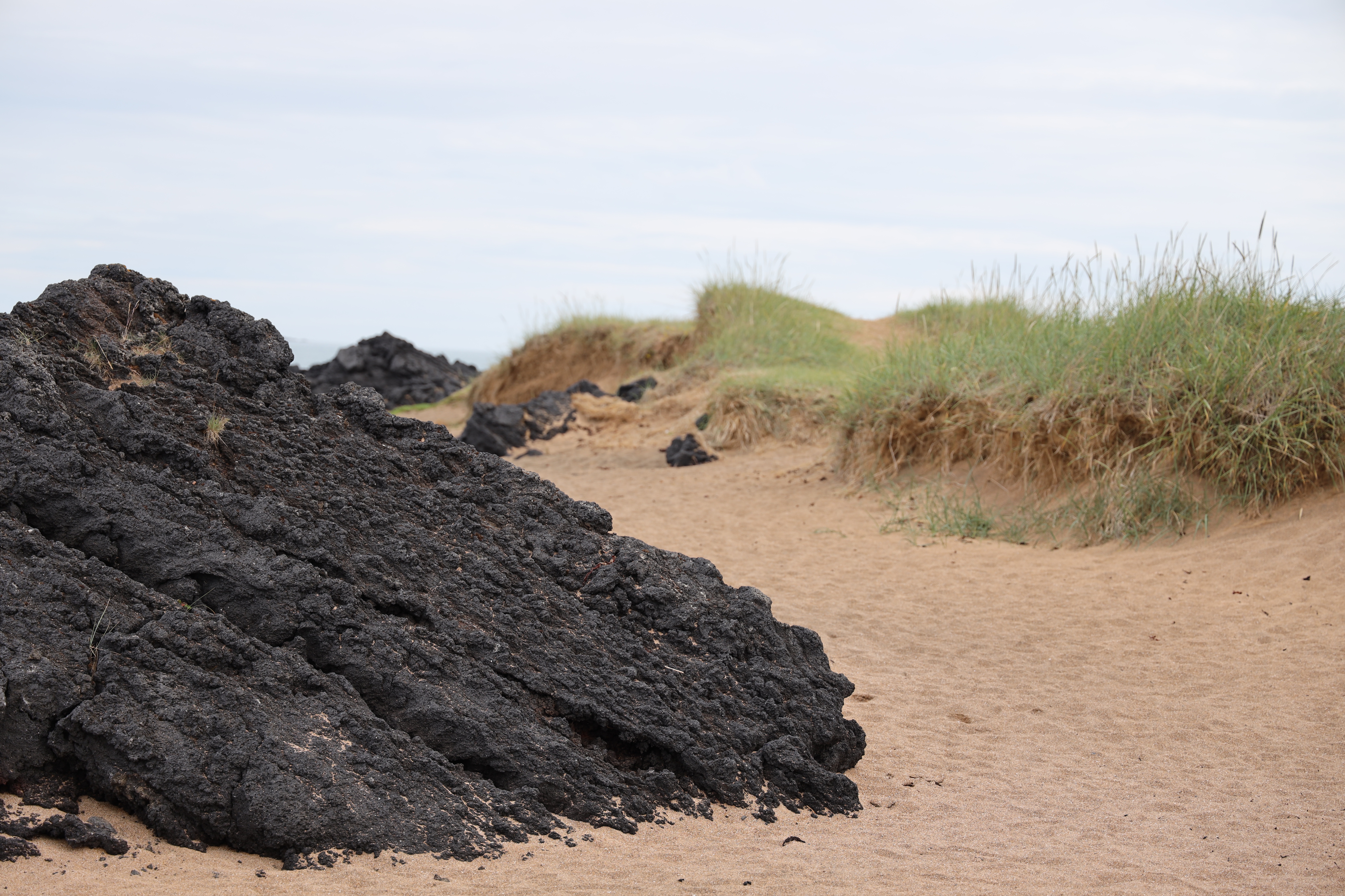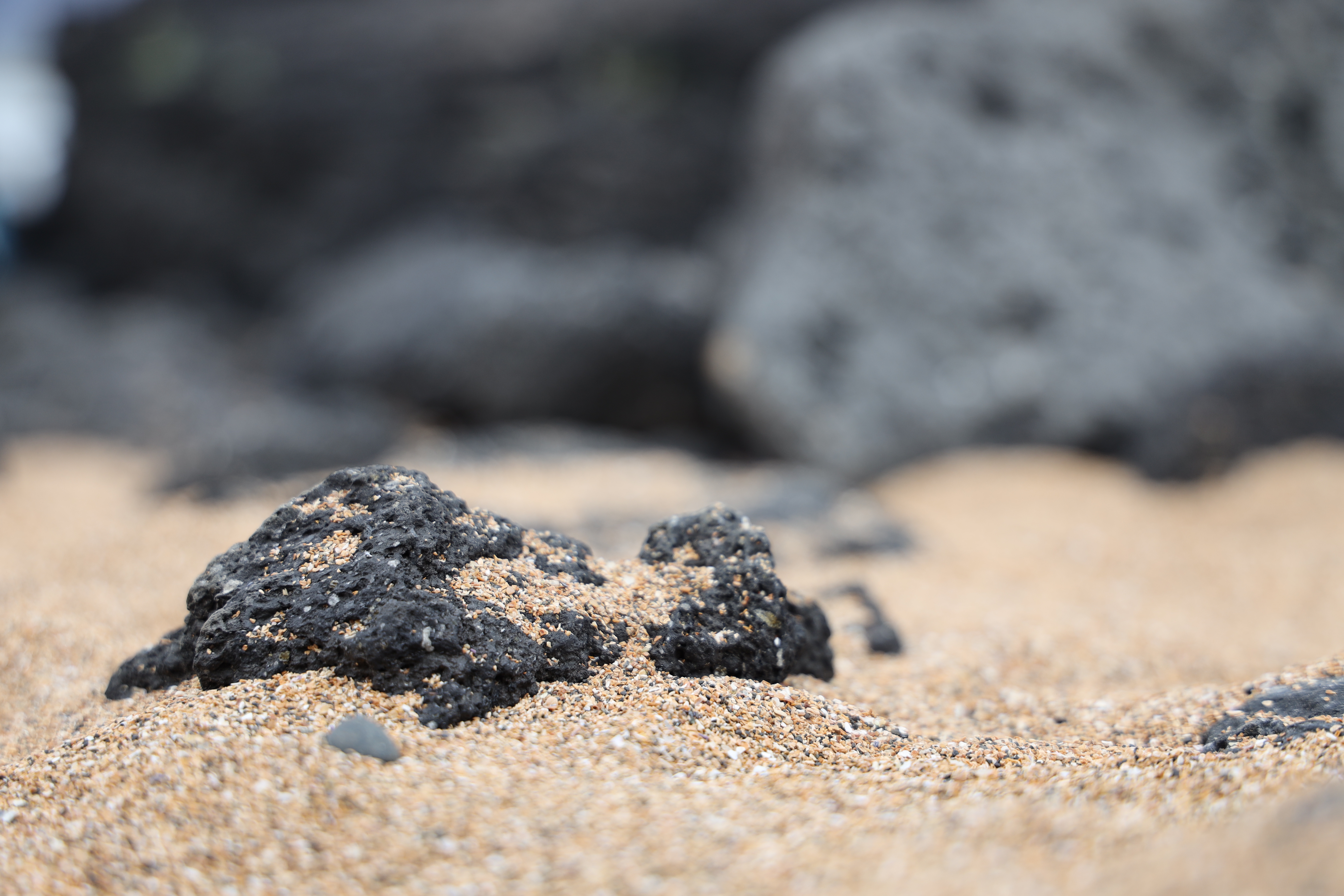 genau gelber Sand zwischen den „normalen“ schwarzen Lavasteinen. Da sind andre Mineralien in der Lava, daher die „untypische“ Farbe.