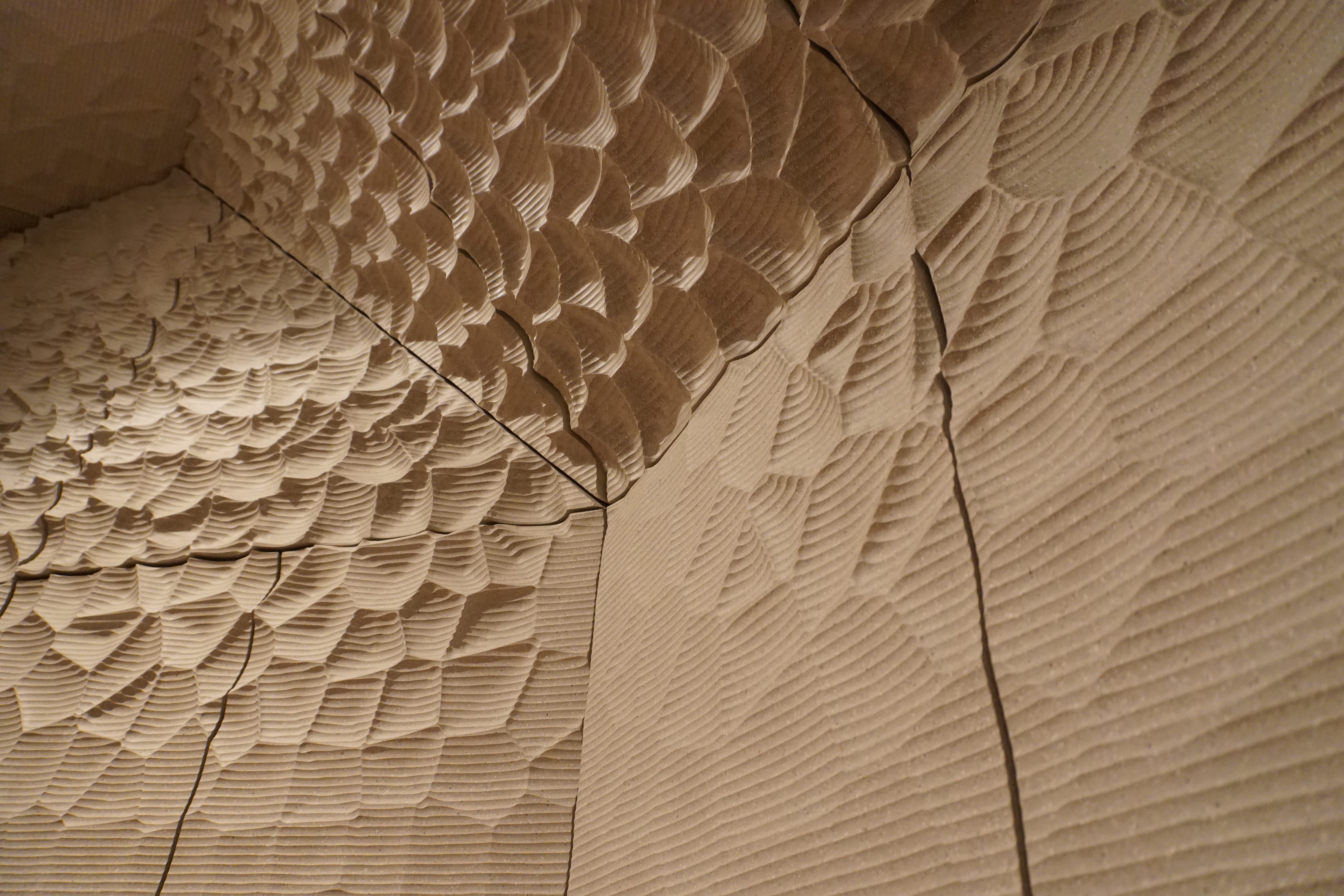 Die Akustikplatten an Wand und Decke mit Riffelung und Vertiefung je nach akustischer Notwendigkeit.
