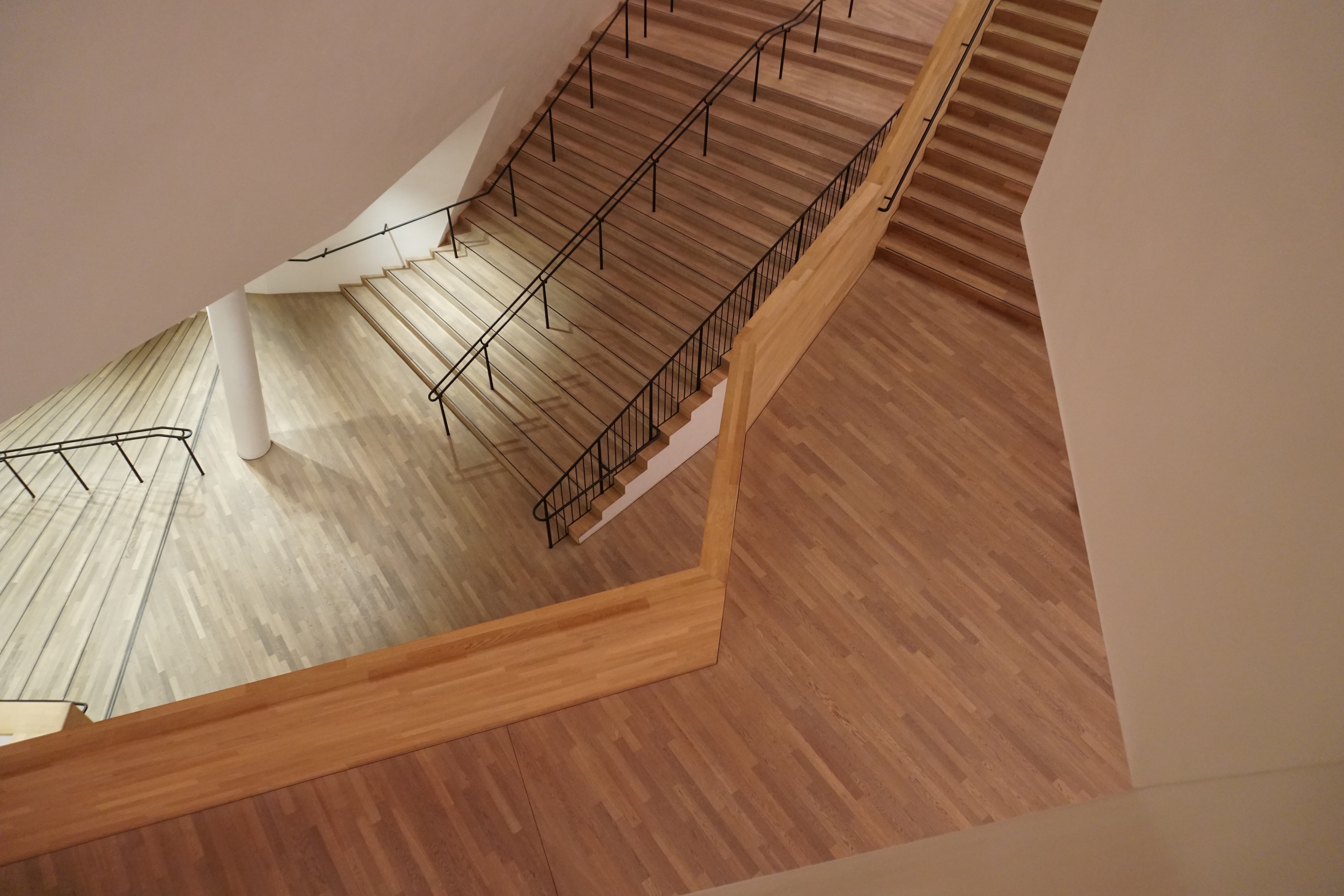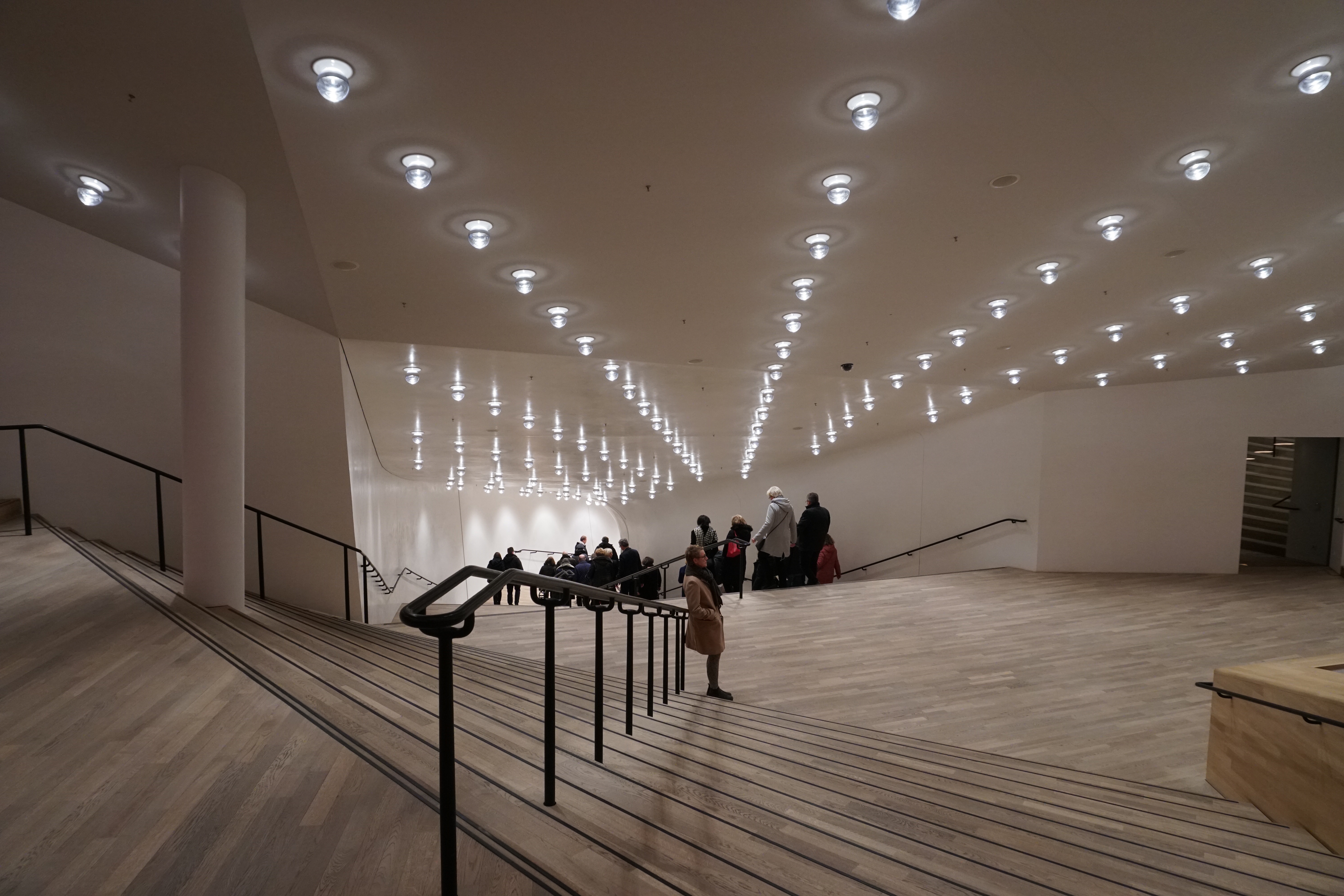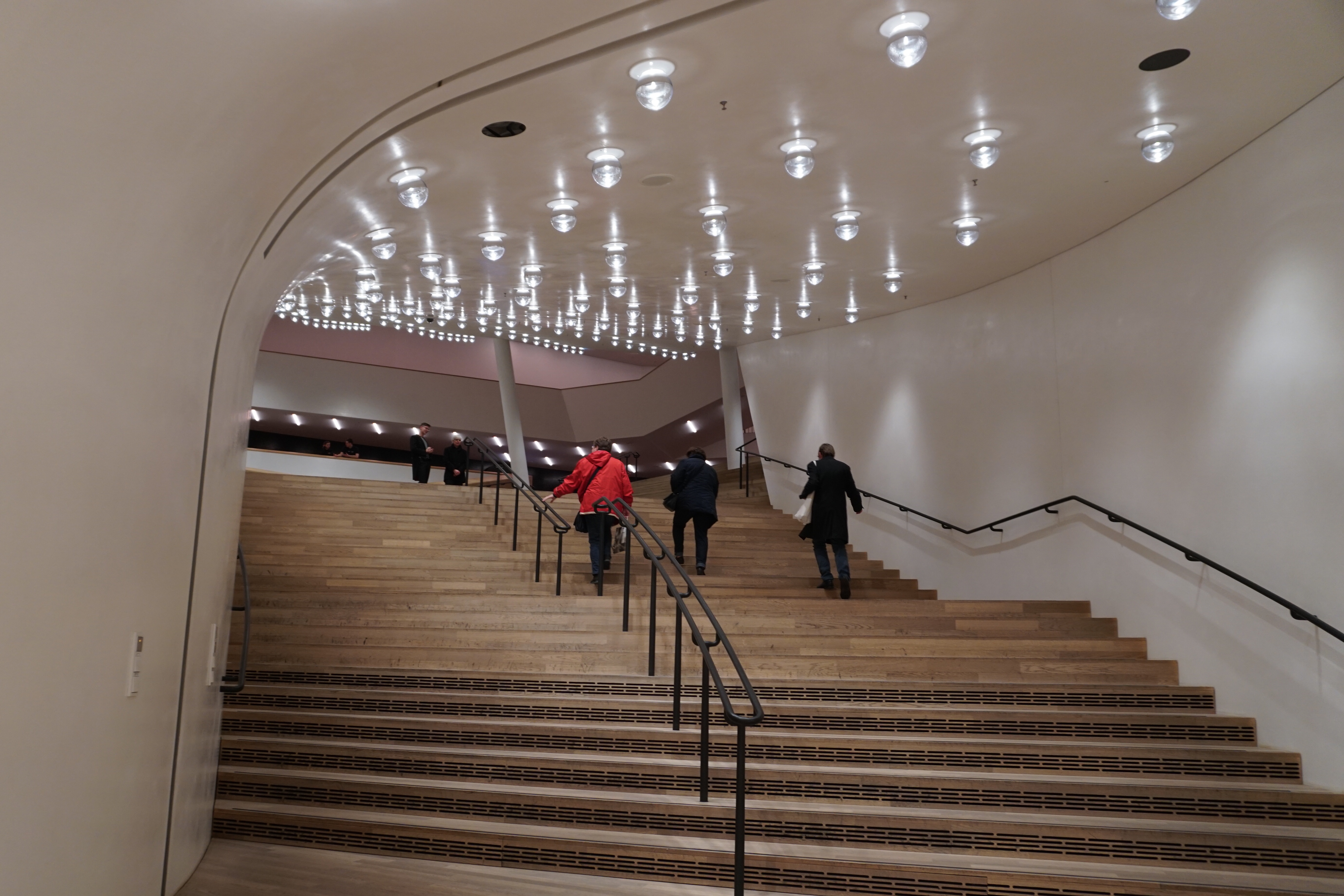 Man kann überall rauf und runter und ganz um den Saal rumlaufen. Von Hafenfensterseite zu Stadtfensterseite.