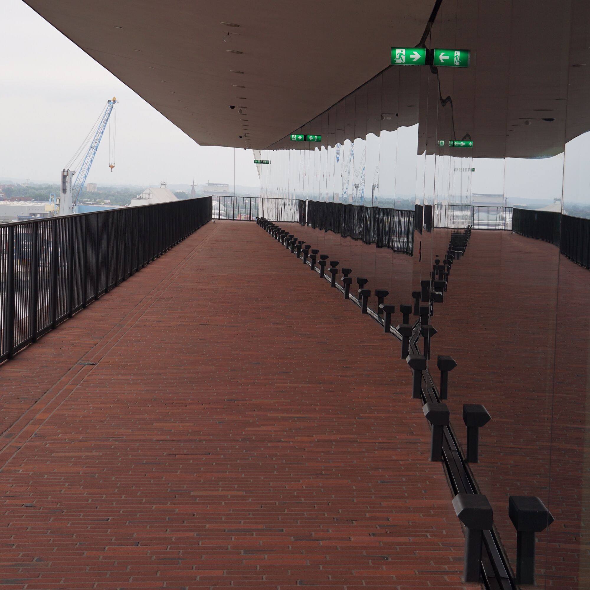 Man kann überall rauf und runter und ganz um den Saal rumlaufen. Von Hafenfensterseite zu Stadtfensterseite.